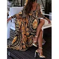 Elegant Formal Long Dresses For Women Sexy Boat Neck Glitter Deep V Neck Print Party Dress Bohemian Retro Dress Female Vestido