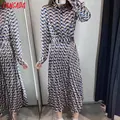 Tangada women elegant dress chain printed bow tie neck long sleeve 2019 korean fashion office lady midi dresses vestidos 5Z50