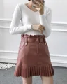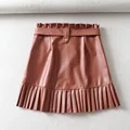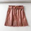 Best Price 2020 Spring Pu Leather Skirts High Waist Pleated Hem Mini Skirts Belt Waist Ladies Faldas with Free Shipping Worldwide!
