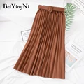 Beiyingni Women Pleated Midi Skirt High Waist Belt Korean Plus Size Spring Summer 2020 Casual Elegant Skirts Ladies Fashion Saia
