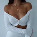 Discount Offer Women Long Sleeve Crop Tops Sexy Deep V Neck Basic Solid Black White Lady Casual Tshirt Sexy Off Sh with Free Shipping Worldwide!